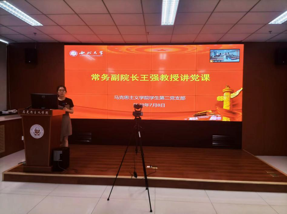7月8日下午,我院学生第二党支部开展“同心庆七一·喜迎二十大”主题党日活动。此次活动邀请我院常务副院长王强教授为学生党员讲授题为《坚持立德树人根本任务办好中国特色社会主义大学——习近平总书记有关教育重要论述的三重逻辑》的党课,学生第二党支部全体党员参加活动,活动由党支部书记郭媛媛主持。