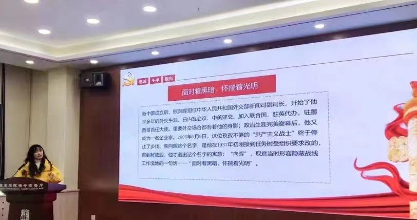 李婕同学以《面对着黑暗,怀揣着光明》为题,讲述了熊向晖同志完美的革命生涯,从解放前的情报生涯和解放后的外交生涯两方面进行了深刻阐述,并结合当下为新中国默默奋斗的英雄事例,让我们明白隐匿在黑暗中的人,也应该被记住,死亡从来都不是终点,遗忘才是。