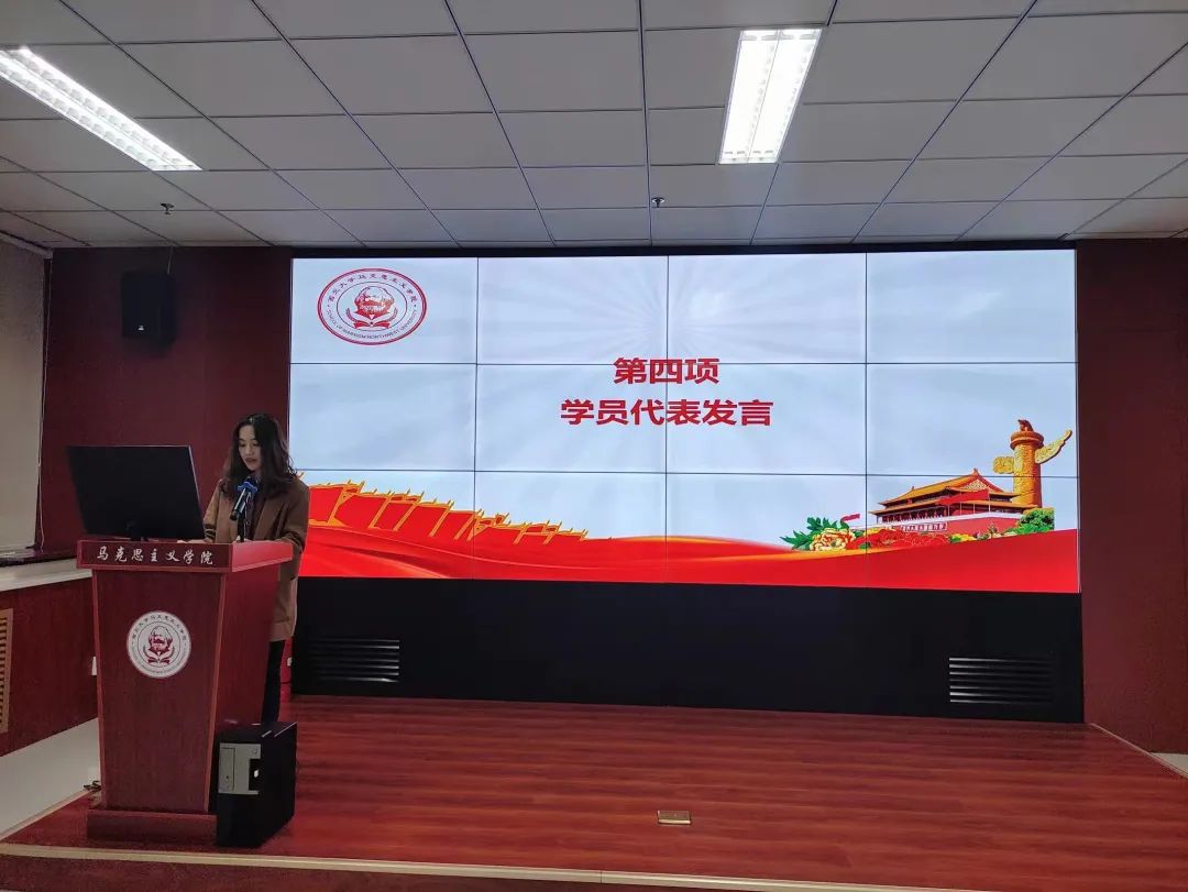 2020级马克思主义基本原理专业的刘婷婷同学作为学员代表发言,她提倡全体学员充分借助“青马班”这一平台,深入学习党的精神,在学习生活中严于律己,坚决遵守“青马班”的规章制度,锤炼自身本领、强化担当作为、不辱青年使命。