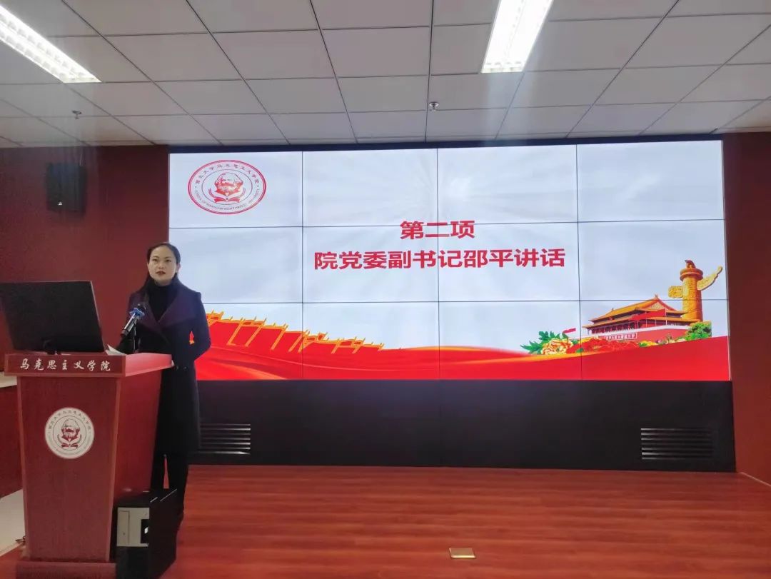 院党委副书记邵平对入选第一期“青马班”的学员们表示热烈的欢迎和衷心的祝贺。她强调了实施“青马工程”的重要意义,要求广大青年不负新时代,做有志青年、有为青年,永葆奋斗激情,为实现第二个百年奋斗目标贡献青春力量。她对学员们提出了四点希望:一是希望同学们坚定理想信念,加强理论学习,不断提高自身政治觉悟、思想境界、道德水平和文化素养;二是希望同学们树立远大志向,选择正确成长道路,将社会主义核心价值观内化为自身的价值追求、道德准则和行为准则;三是希望同学们坚持自我教育,积极参与“青马班”理论和实践培训,不断强化自我教育、自我管理、自我服务的主体意识;四是希望同学们锻炼创新思维,扎实实践工作,努力使自己成为有信仰、有知识、有能力、有悟性的复合型人才。