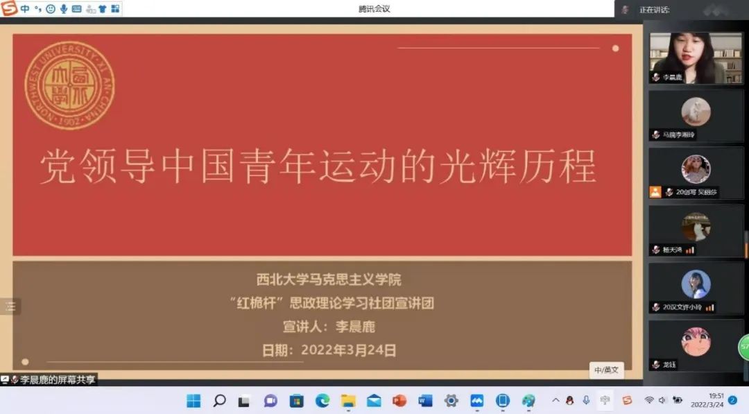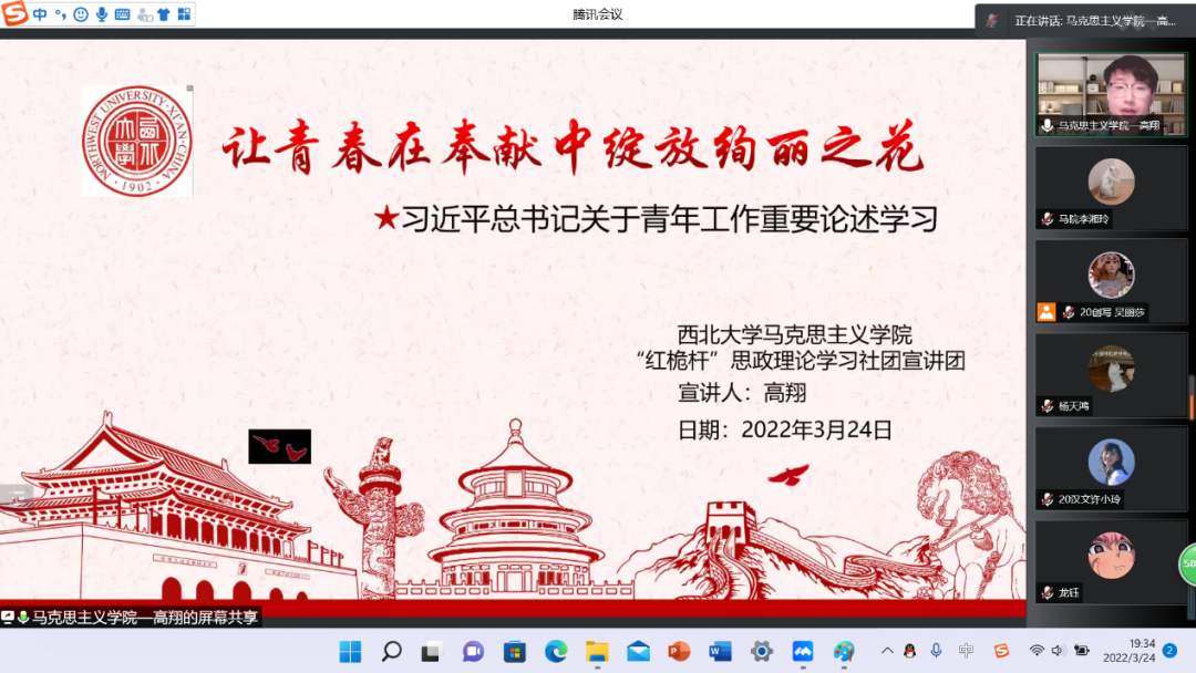 2022年3月24日,马克思主义学院“红桅杆”思政理论学习社团面向西北大学文学院2020级本科生开展了线上理论宣讲活动。本场活动的主讲人分别是2021级思想政治教育专业硕士研究生李晨鹿、2021级马克思主义中国化研究专业硕士研究生高翔和2021级思想政治教育专业硕士研究生刘素琪。