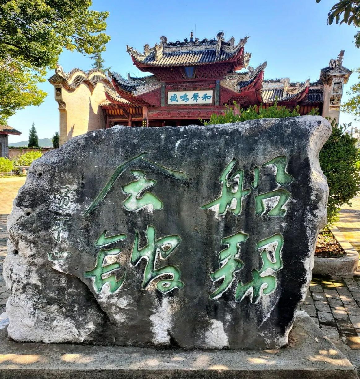 正面是牌楼,背面却是一座戏楼。戏楼建筑雄伟,造型奇巧,有“兼具南秀北雄”之誉。其顶端中央为宝塔式彩瓷装饰,楼顶的屋脊和飞檐翘角上的彩龙均以彩色瓷片镶嵌而成。戏楼的画额梁柱多为镂空木雕,惟妙惟肖,形态逼真。楼上演戏,楼下可供上百人“安营下寨”。