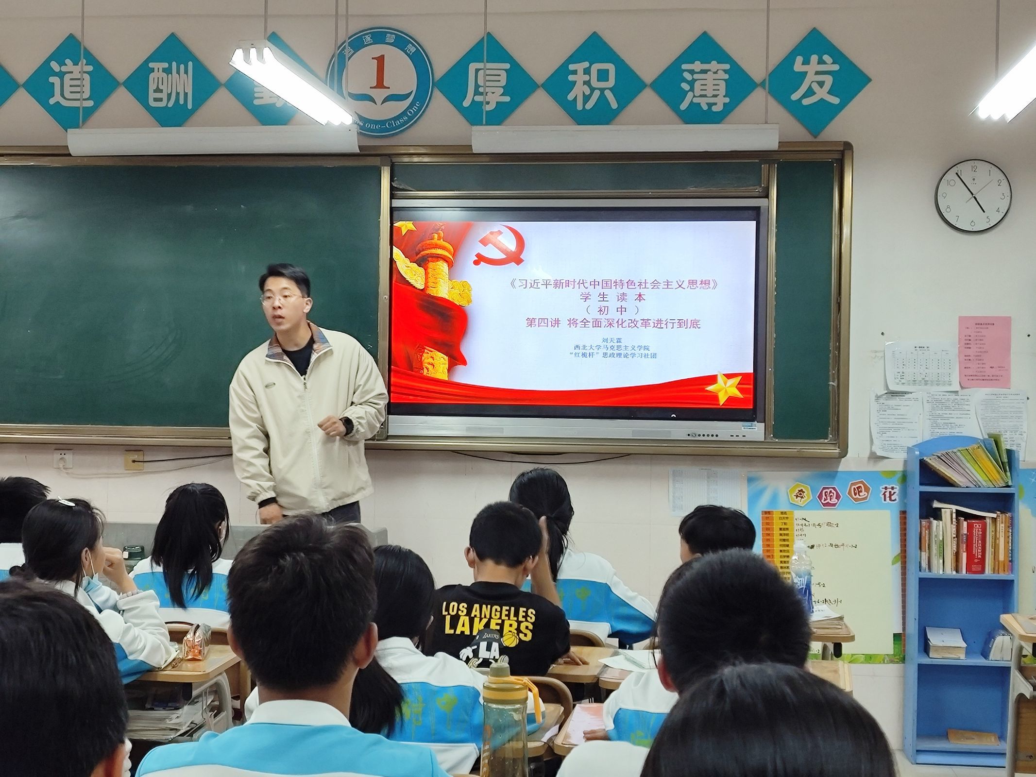 4月25日,我院“红桅杆”思政理论学习社团在长安区西北大学附属初级中学开展“思政宣讲进课堂” 。社团成员以《习近平新时代中国特色社会主义思想学生读本》为主要内容,在七年级的两个班级中进行了思政宣讲。本次主讲人是来自21级中国近现代史基本问题研究专业的硕士研究生黄文馨和22级马克思主义中国化专业的硕士研究生刘天霖。