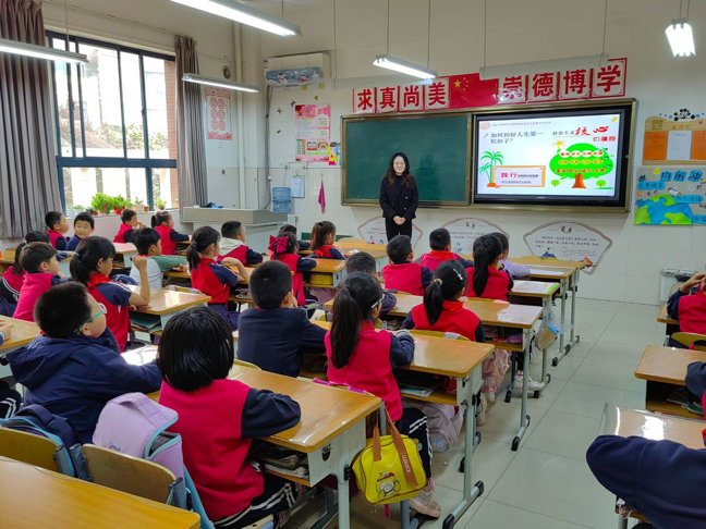 张依芳以《美丽中国是我的家》为题,通过播放歌曲《我爱你,中国》,让同学们寻找歌曲中赞美祖国的句子来抒发自己的爱国之情。