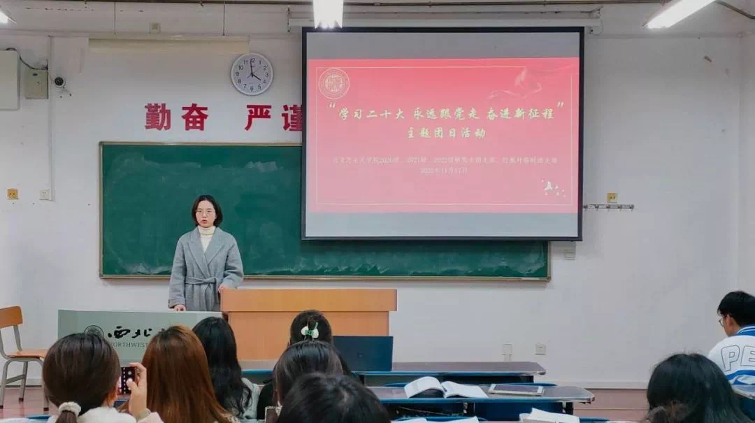 为充分发扬实践党的二十大精神,推动理论宣讲工作落地生根,以青年声音传播党的先进理论,我院下属“红桅杆”思政理论学习社团理论开展了一系列理论宣讲活动:10月20日,社团在文化遗产学院开展线上理论宣讲。主讲人2022级硕士研究生彭佳佳、李雨潇和任炫蓉通过梳理党史脉络,鼓舞青年学子在新时代中踔厉奋发、艰苦奋斗。11月4日,社团在信息科学与技术学院开展线下理论宣讲。主讲人2022级硕士研究生彭佳佳、杨靖垭通过宣讲,带领青年学子深刻领略了中国共产党百年伟大历史征程与党带领人民铸就的辉煌伟业。11月13日,社团在长安区凤林社区万科润园小区开展理论宣讲。主讲人2022级硕士研究生刘天霖、李雨潇向社区居民介绍了党的二十大精神的核心内容,充分发扬青年学子带头示范的作用。11月17日,“党的二十大精神宣讲团”成员、2021级博士研究生刘超在“学习二十大,永远跟党走,奋进新征程”主题团日活动上,以《高举旗帜凝心聚力团结一致向前进》为题进行了宣讲。11月21至22日,社团在外国语学院开展党课培训宣讲。主讲人2022级硕士研究生李雨潇、武益帆、彭佳佳、罗欣媛通过对党的二十大进行文本解读,带领大家学习了党在中国现代化百年奋斗历程中矢志奋斗、顽强拼搏的事迹,为传递新时代先进思想、凝聚新时代青年共识贡献了自身力量。12月2日,社团在西北大学学生会开展理论宣讲。主讲人2022级硕士研究生李雨潇、杨靖垭带领大家在会议精神的学习中砥砺初心使命,汲取奋进力量。12月13日,社团在西北大学学生会、新闻传播学生会、化学与材料科学学院学生会联合活动开展理论宣讲。主讲人2022级硕士研究生杨靖垭、罗欣媛通过讲述党史故事,充分发扬了我院学子蓬勃的力量、坚毅的姿态。