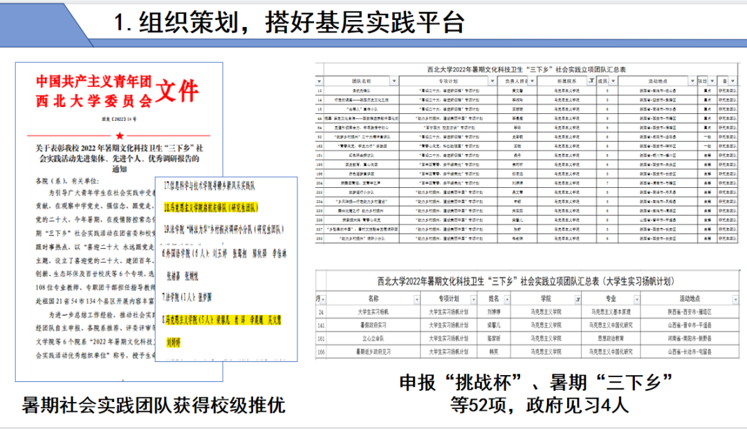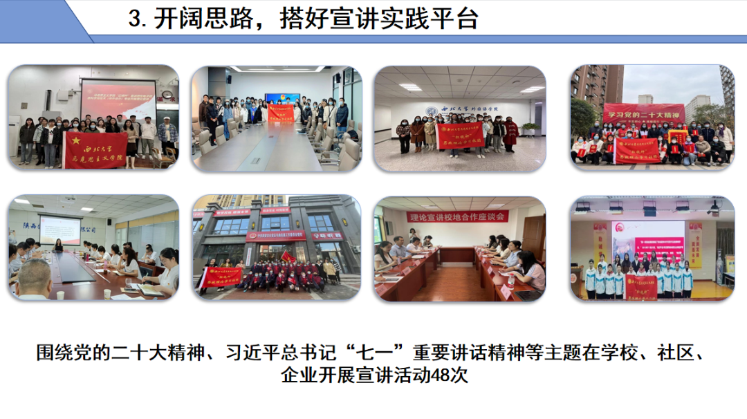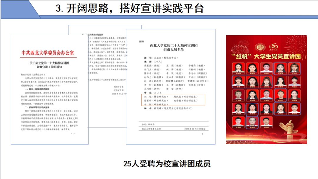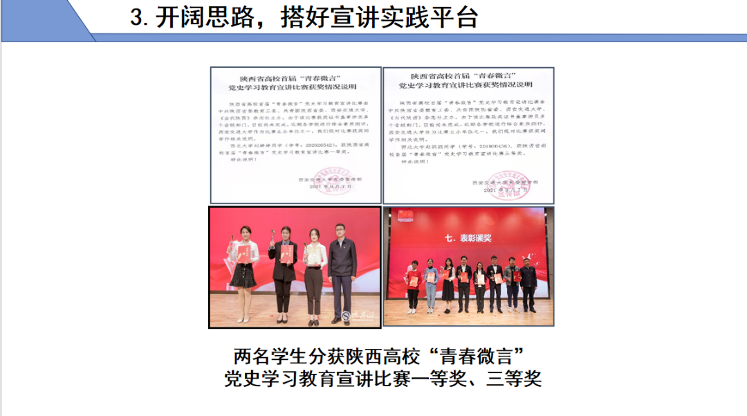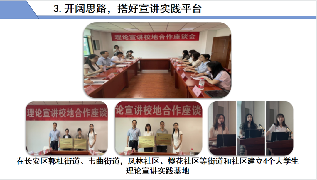 开阔思路,搭好宣讲实践平台。开展校地合作,协助学院在社区建立大学生理论宣讲实践基地,搭建基层宣讲平台,在社区、企事业单位开展宣讲48次;彰显朋辈价值引领,在校内开展宣讲32次。2人在省级比赛中获奖;25人受聘为校宣讲团成员。