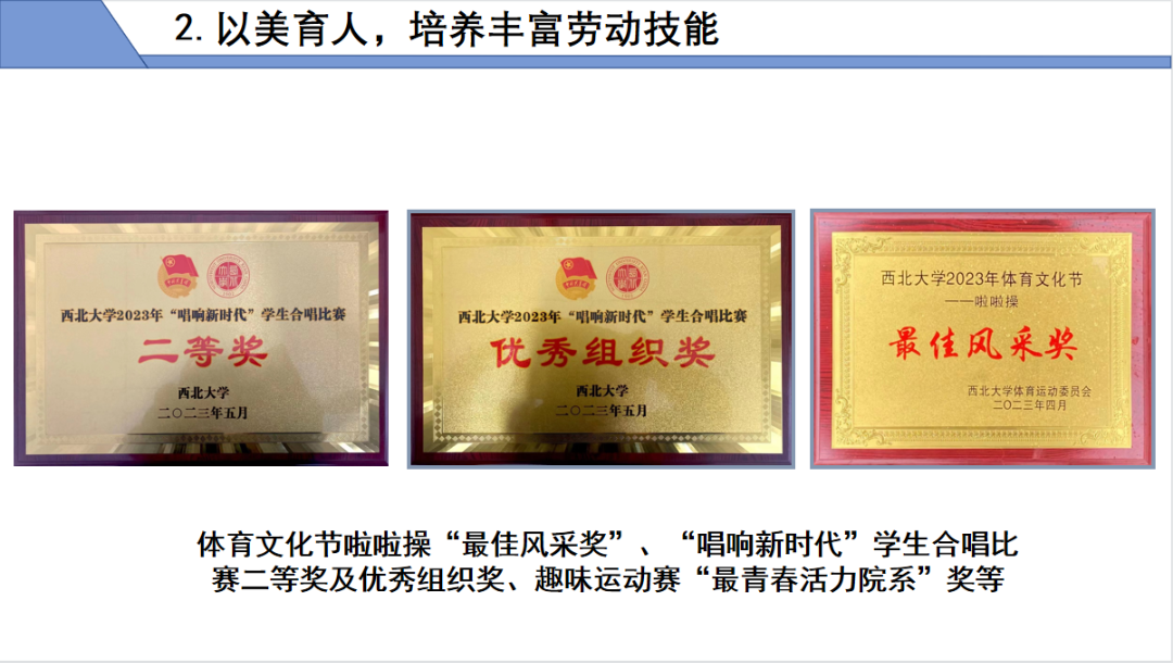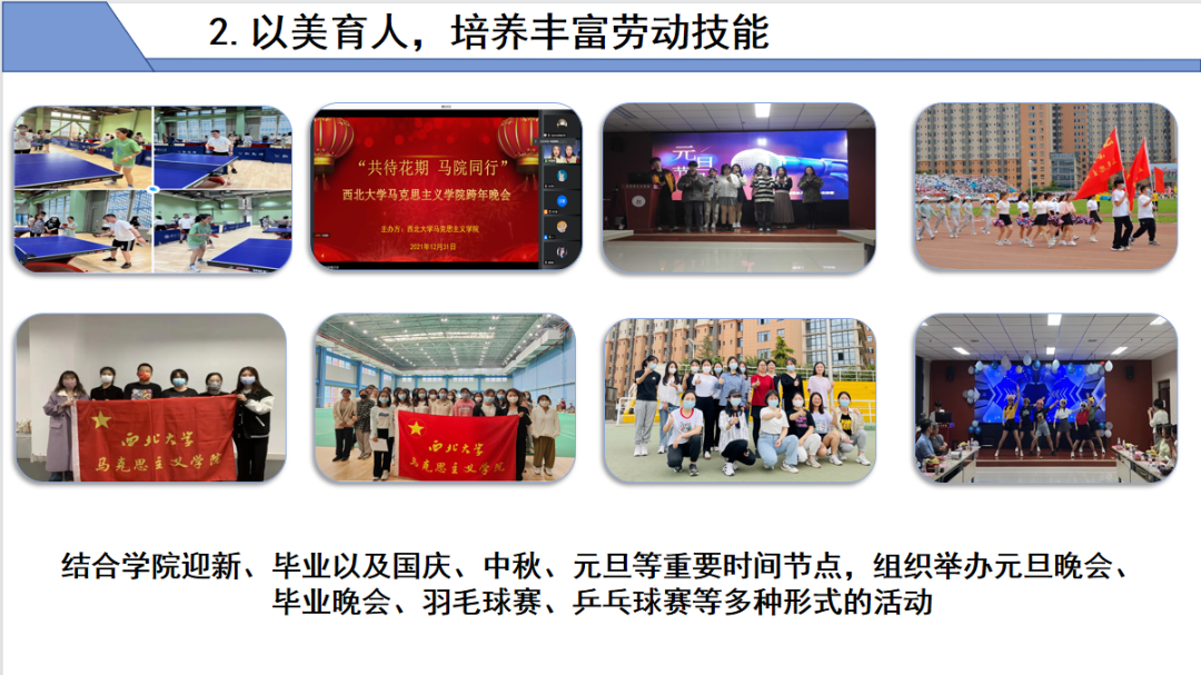 以美育人,培养丰富劳动技能。研究生文体实践多元化发展。结合学院迎新、毕业以及国庆、中秋、元旦等重要时间节点,组织举办元旦晚会、毕业晚会、羽毛球赛、乒乓球赛等多种形式的活动,并积极鼓励并组织学生参加体育文化节、合唱比赛、趣味运动会、定向越野比赛等文体活动,获体育文化节啦啦操“最佳风采奖”、“唱响新时代”学生合唱比赛二等奖及优秀组织奖、趣味运动赛“最青春活力院系”奖,提高学生综合素质。
