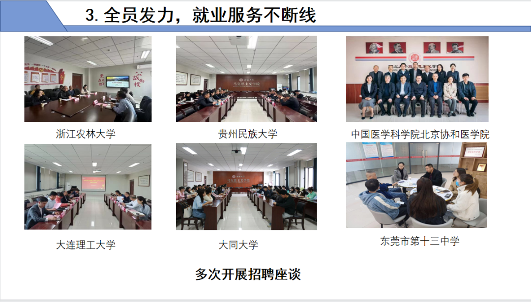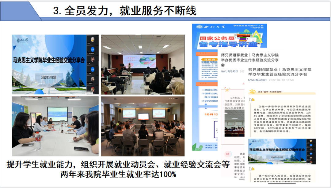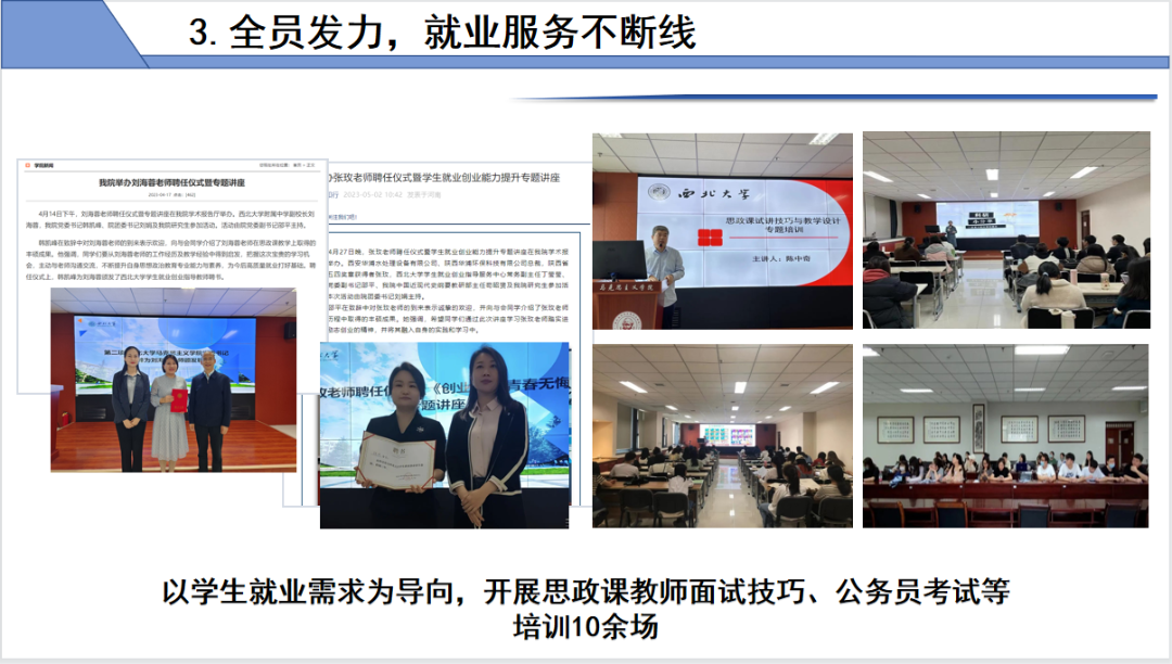 全员发力,就业服务不断线。以学生就业需求为导向,开展思政课教师面试技巧、公务员考试等培训10余场;邀请西大附中刘海蓉老师、西安华浦公司张玫总裁担任就创指导教师;组织浙江农林、贵州民大、大同大学、山西农大、东莞市第十三中学等来校进行招聘座谈;直面学生就业观问题,通过毕业生经验交流分享会、“师兄师姐谈就业”、“一对一”谈话等,引导树立积极就业观。