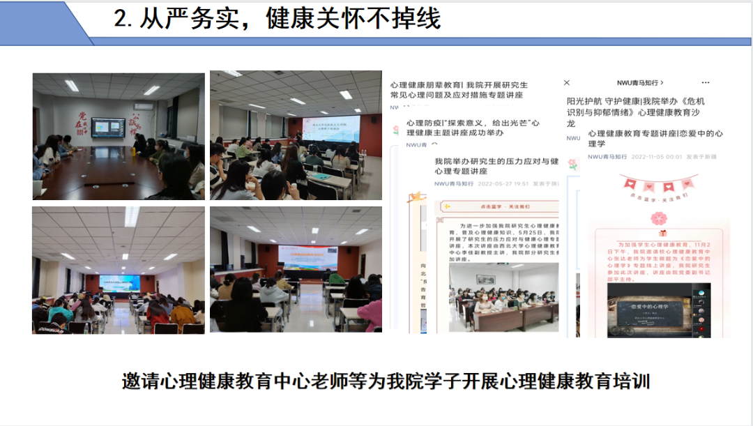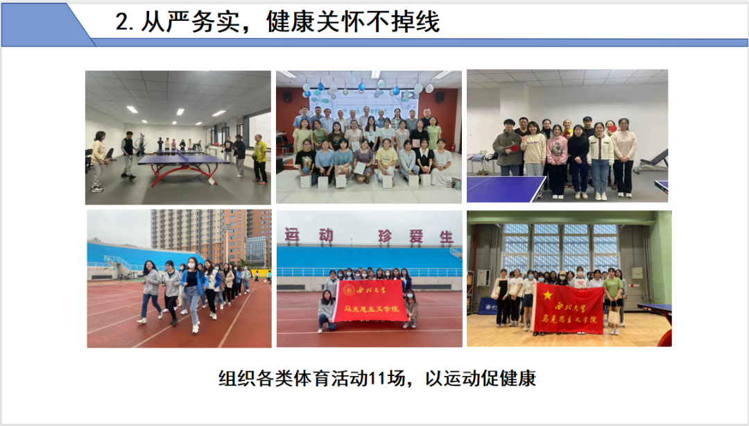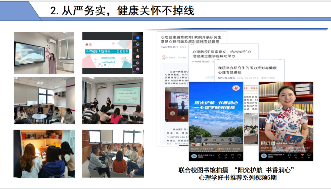从严务实,健康关怀不掉线。组织心理健康教育专题讲座、心理健康知识竞赛、心理健康教育主题征文等20余场;普及心理健康知识,添置心理学书籍;与校图书馆联合录制发布心理学书籍读书分享视频;以运动促健康,组织各类体育活动11场。