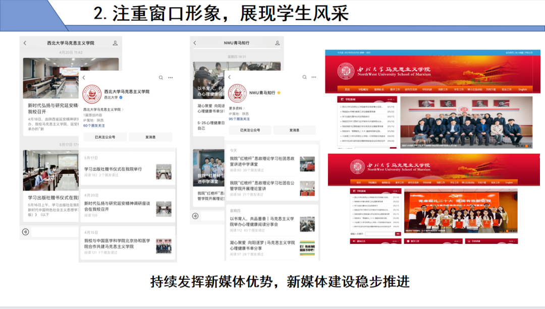 注重窗口形象,展现学生风采。持续发挥新媒体优势,新媒体建设稳步推进。用好学院“NWU青马知行”公众号、马院官网、马院公众号等网络平台,不断提升网络教育的感染力和实效性。