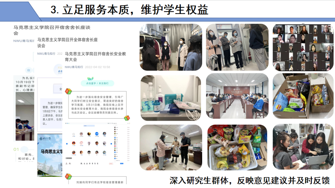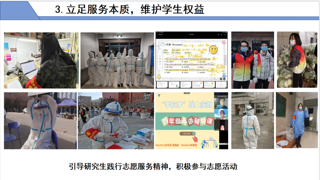 立足服务本质,维护学生权益。权益服务渠道多方开启。深入研究生群体,反映意见建议并及时反馈;引导研究生践行志愿服务精神,积极参与志愿活动;疫情期间组建互助小组,帮助解决学生急难愁盼问题。