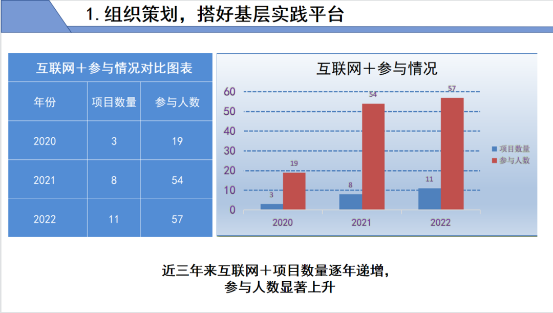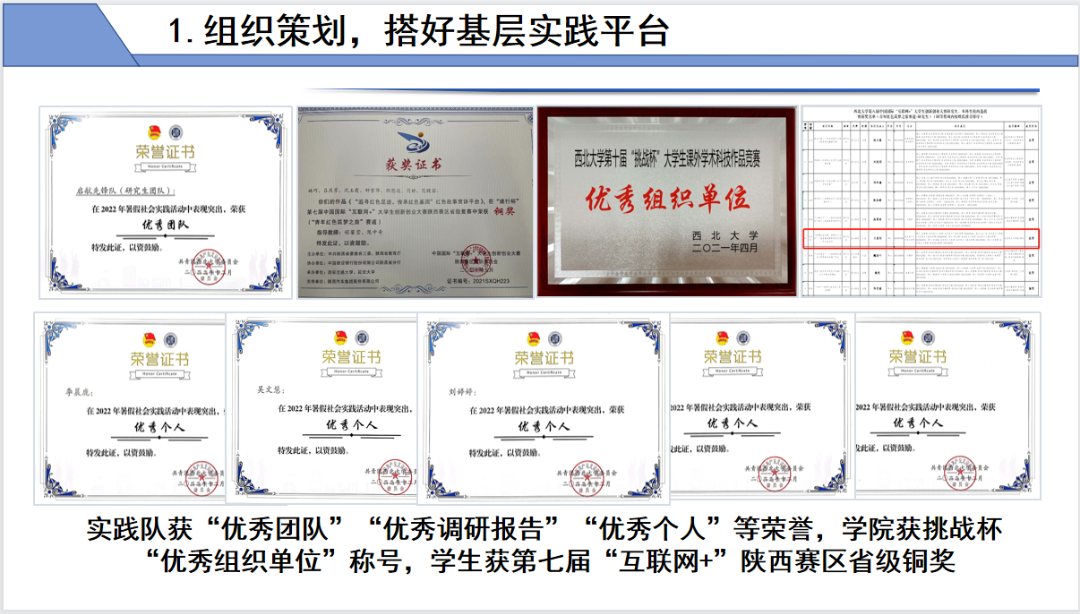 组织策划,搭好基层实践平台。加强学生基层实践力,“三下乡”实践项目数量质量均有提升;加强实践竞赛组织策划,参与人数显著上升,竞赛成绩取得突破,学生在“互联网+”大赛中获省级复赛铜奖、校级决赛银奖,在“挑战杯”竞赛中获校级奖,学院获优秀组织单位。