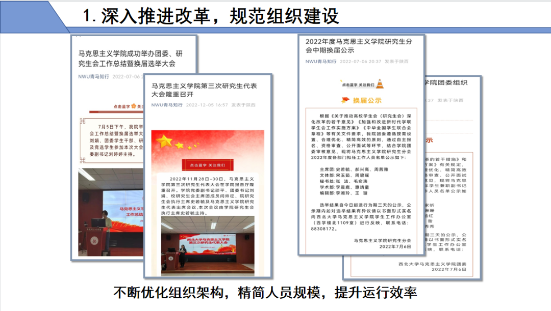 深入推进改革,规范组织建设。不断优化组织架构,精简人员规模,提升运行效率。经改革,我院研会工作人员共11人。始终高度重视人才培养培训工作及组织建设工作,积极开展组织培训。