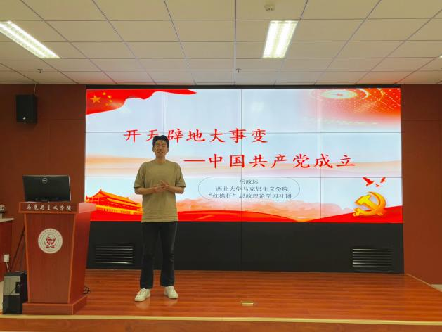 紧接着,西北大学红桅杆思政理论学习社团骨干岳政远和长安大学中国特色社会主义理论学习研究会社团骨干杜长鹏开展理论宣讲。岳政远以《开天辟地大事变—中国共产党成立》为题,以中共一大会址的图片导入,介绍了中共一大召开的波折历程,希望同学们在党的故事、革命的故事、英雄的故事中读懂中国共产党人的初心和使命,让红色基因、革命薪火代代传承。杜长鹏以《伟大建党精神是中国共产党人精神谱系的源头活水》为题,讲述了中国共产党人精神谱系的开辟起点、核心脉络、思想源泉、精神实质、重要支撑与发展动力,鼓励青年大学生从中国共产党人精神谱系中汲取青春奋进力量,做建功新时代的不懈奋斗者。
