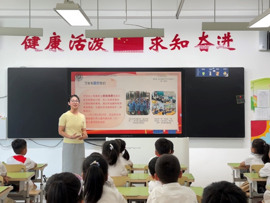 岳政远以《习近平爷爷心系人民群众》为题,通过讲述一些事例,引导同学们意识到习近平爷爷对人民群众的关切之情,最后鼓励同学们努力成长为德智体美劳全面发展的社会主义建设者和接班人。