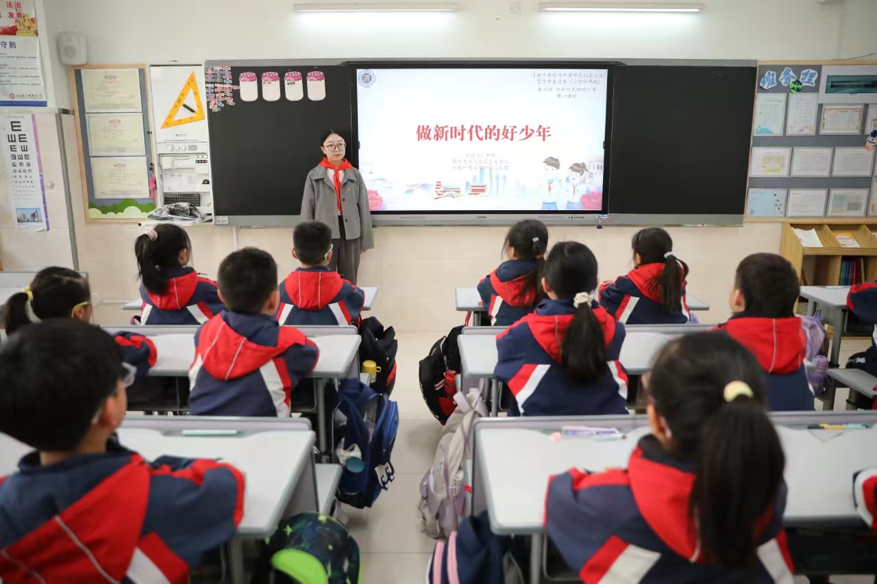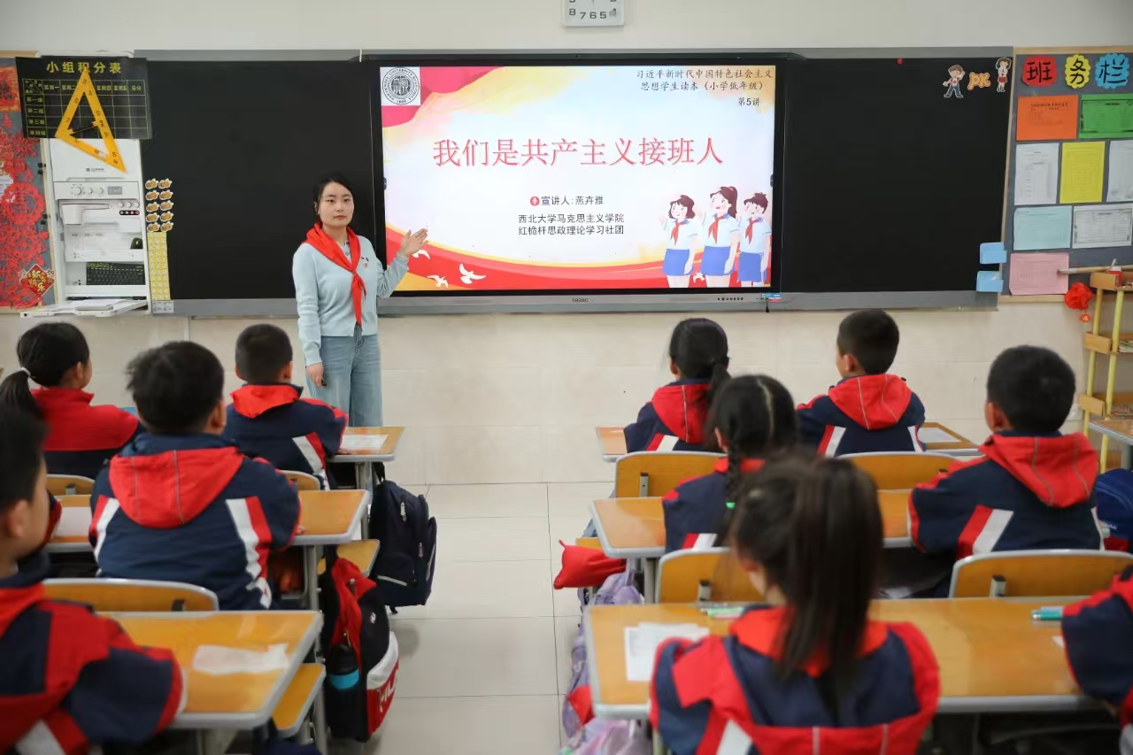 3月21日,我院红桅杆思政理论学习社团在西安航天城第四小学,以《习近平新时代中国特色社会主义思想学生读本》(小学低年级)为主要内容,为三年级的小学生讲授思政课。主讲人分别是来自2023级和2024级思想政治教育与中国近现代史基本问题研究专业的6名硕士研究生。