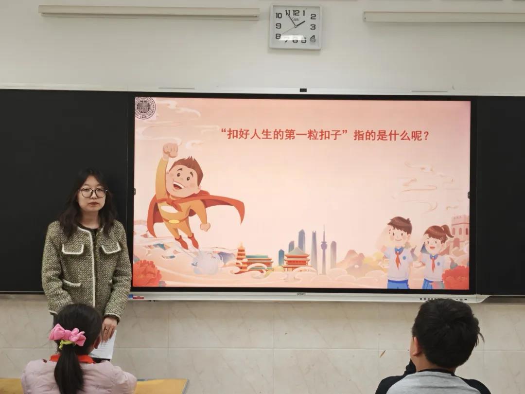 冯金香以《扣好人生第一粒扣子》为题,讲述了布茹玛汗·毛勒朵和黄大发的感人事迹,鼓励同学们以先进模范为镜,从身边小事做起,在日常学习和生活中自觉践行社会主义核心价值观,努力成长为德智体美劳全面发展的新时代好少年。