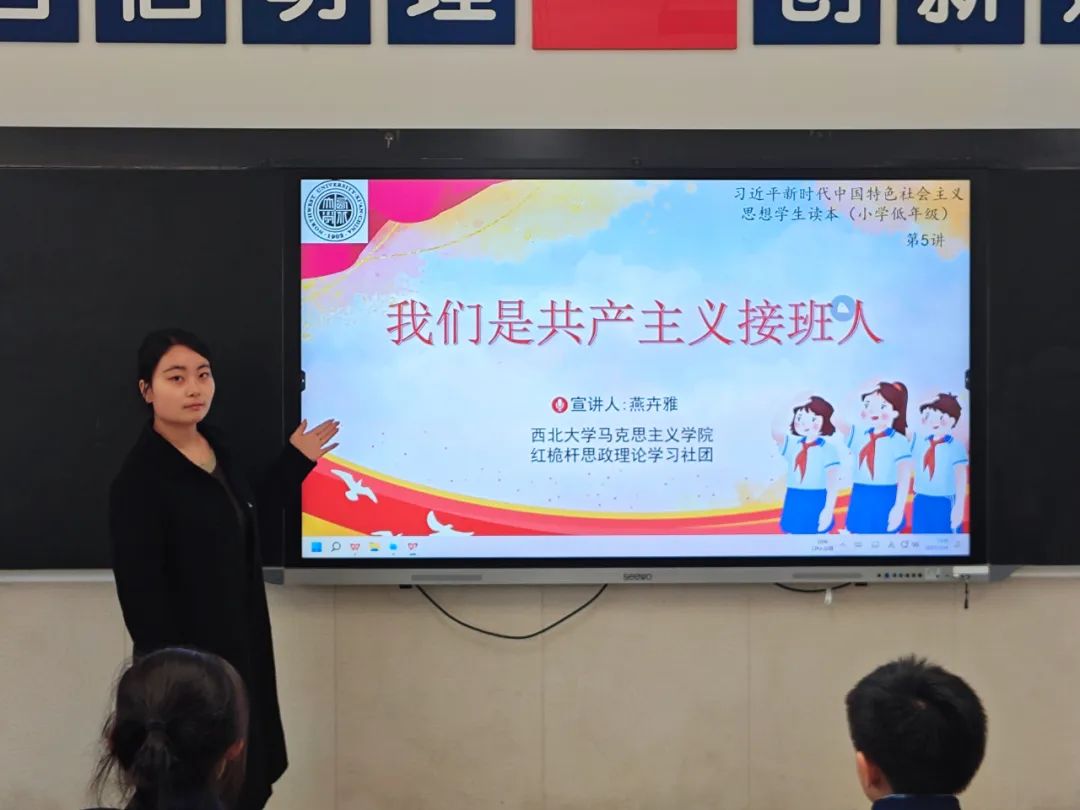 3月14日,我院红桅杆思政理论学习社团在西安航天城第六小学,以《习近平新时代中国特色社会主义思想学生读本》(小学低年级)为主要内容,为二年级的小学生讲授思政课。主讲人分别是来自2023级和2024级思想政治教育与中国近现代史基本问题研究专业的6名硕士研究生。