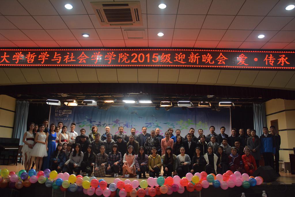 桃李芬芳,硕果累累,金秋时节我们哲社院再一次迎来新的同学们,他们满含朝气,他们满怀希望!为了拉近与新生的距离,表达我院对学生的热烈欢迎,为了让新生尽情展示他们的风采,经过一个多月的精心准备,11月17号晚7点,我院在长安报告厅隆重举行了以“爱·传承”为主题的迎新晚会。出席晚会的领导嘉宾有:院党委书记马朝琦老师,院长杨洪老师,副院长王永智老师,副院长王强老师,副院长李宪清老师,院党委副书记李波老师,研究生院王海波老师,社会工作系主任魏哲铭老师。另外出席晚会的嘉宾还有李健森老师,胡军良老师,苟昭赟老师,陈中奇老师,王元琪老师,李志松老师,马新宇老师,郭振华老师,马新锋老师,袁志伟老师,孙明哲老师,齐钊老师,袁成老师,团委书记刘建波老师,辅导员李鑫老师。此外还邀请了校学生会代表、各院系代表、各社团代表等嘉宾前来观看晚会,我院全体学生观看了此次晚会,场下座无虚席。