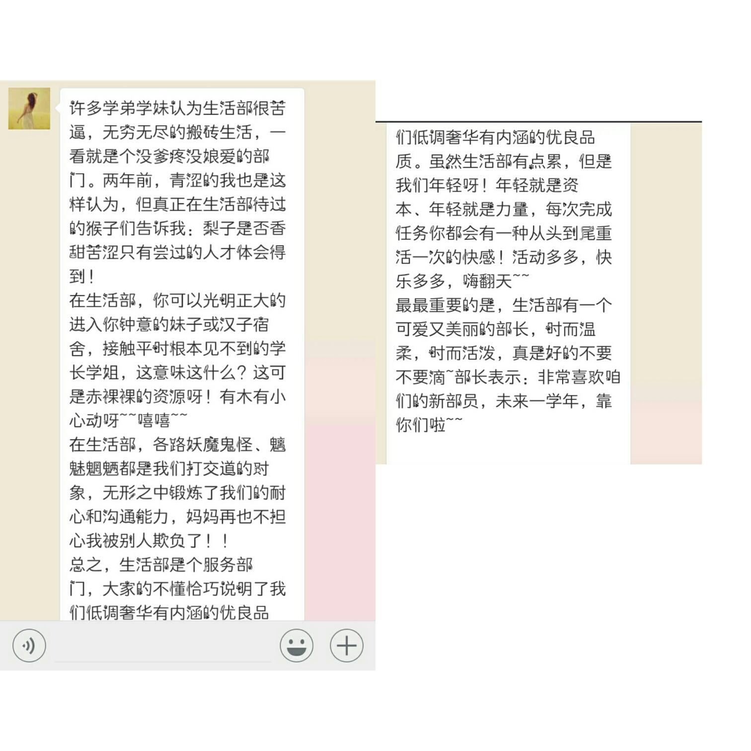 最后一个是生活部的时葱葱学姐。对啊,生活部事情的确挺多挺累的,但是我们年轻呀我们有资本呀,何不趁着自己还能干的时候多做一些事情以后也有美好的回忆呢?