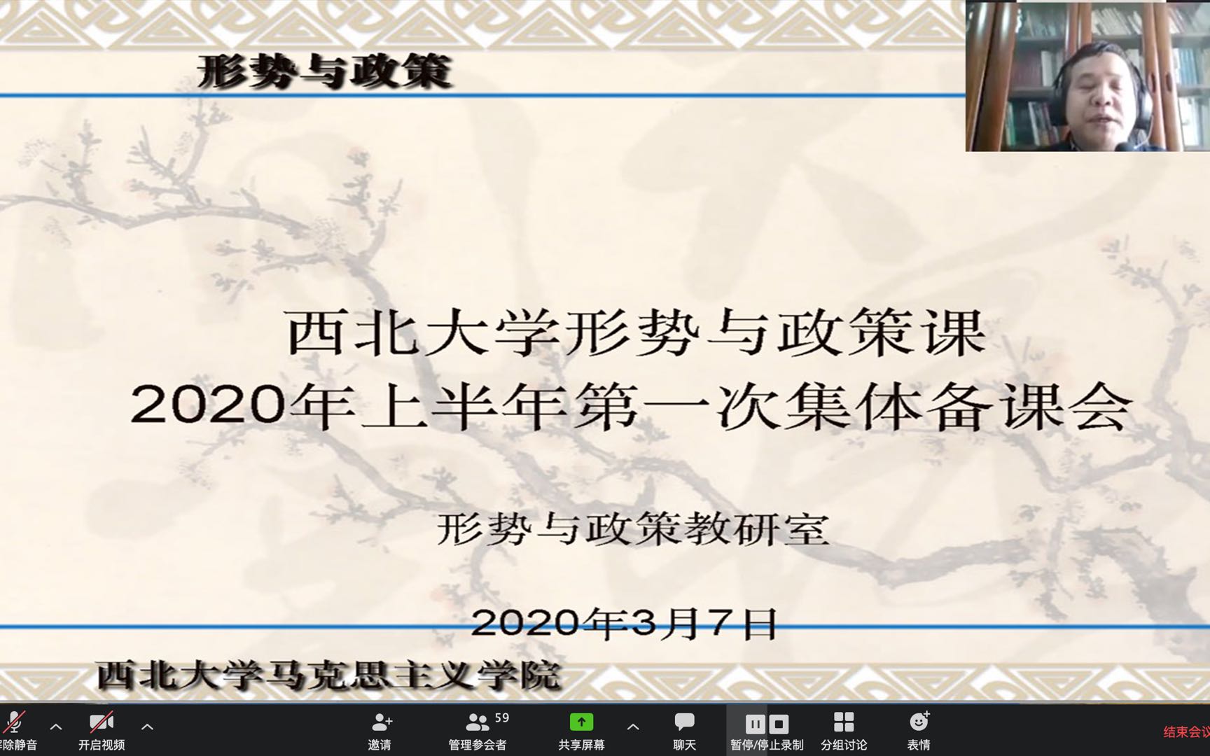 3月7日下午,为传达和贯彻习近平总书记关于新冠肺炎疫情防控工作一系列重要讲话和指示精神,我院联合学生工作部召开形势与政策课网络集体备课会。备课会由学工部董国强部长主持,我院王强院长、教学副院长李志松、形势与政策教研室主任曹建军、副主任赵沛、本学期承担“形势与政策”课教学任务的院(系)学生工作负责人和辅导员共60余人参加了会议。