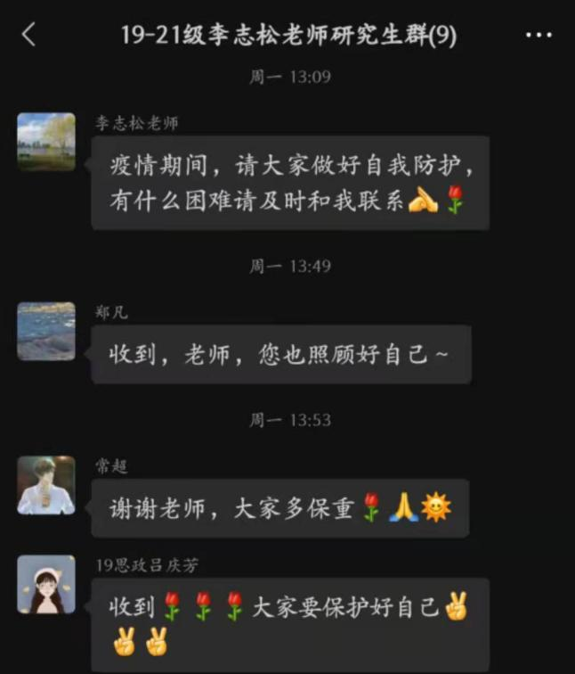 二是抓好导师队伍,导师全面参与学生疫情防控管理。院党委要求全体博、硕导切实负起责任,全面参与、积极配合学院做到学生管理“不漏一人”。学院将全体学生分为6组,由6名院领导带队和导师各负责一组,每个组的工作任务为:一是及时传达各级疫情防控工作要求;二是做好学生思想教育工作,引导学生以积极心态应对疫情,合理安排学习生活;三是结合教学科研要求,每周至少开展一次形式灵活的线上活动;四是了解学生实际困难和需求,及时协调、解决。做到及时关心慰问学生,及时掌握学生思想状况,让学生真切感受到来自学院和导师的关爱和温暖。