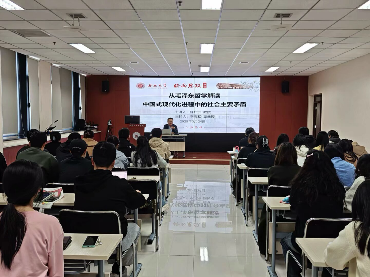 3月24日上午,中共中央党校教授、博士生导师薛广洲应邀做客“终南思政讲坛”第40期,为我院师生作了题为《从毛泽东哲学解读中国式现代化进程中的社会主要矛盾》的学术讲座。讲座由我院李志松副教授主持,学院部分教师和博、硕士研究生近70人参加。